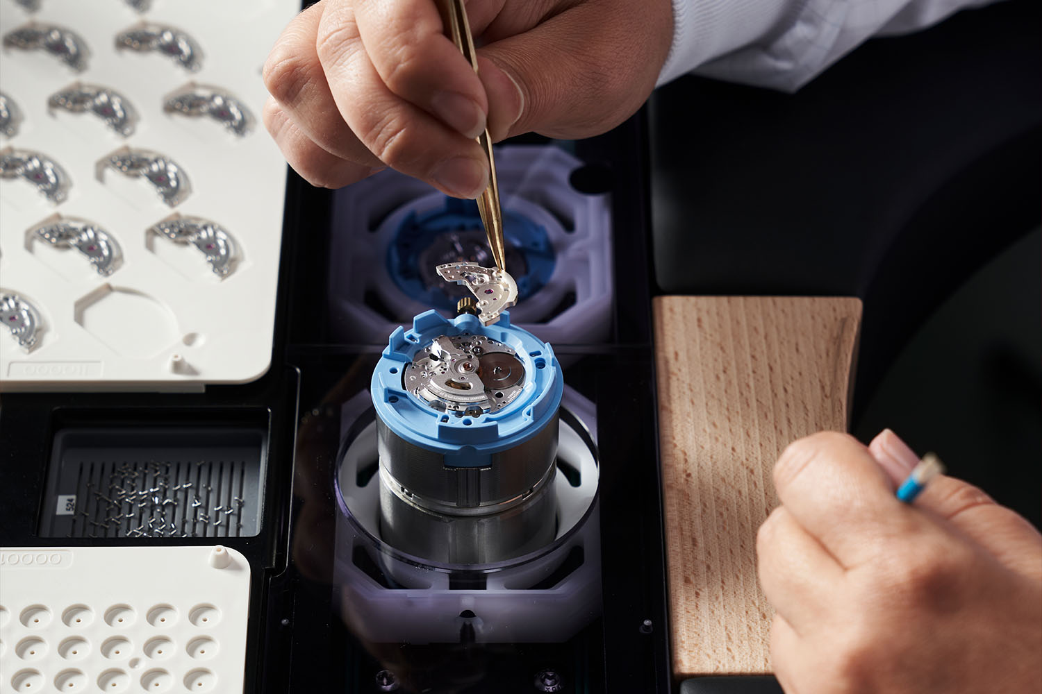 Once automated chronometry testing is completed, the watchmakers assemble auxiliary dials and hands so that the movements can be shipped to COSC (the Contrôle Officiel Suisse de Chronomètres) for accuracy testing during a three-week period. Once back at Kenissi, the movements go back onto the assembly line, where automatic winding systems are assembled.