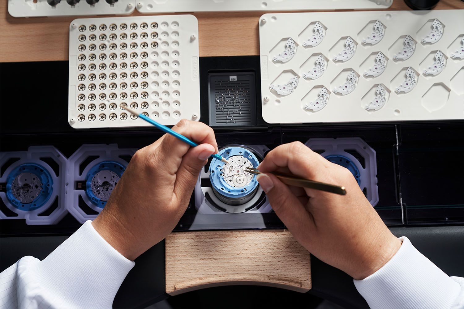 Because Tudor doesn’t keep excess stock of watches on hand, its watchmakers must be flexible, agile, and able to work on multiple references within the catalog. The workforce is here divided into “cells,” each of which contains a number of benches. Each bench is laid out the same way within the respective cell, making for a homogeneous and ergonomic environment — one that’s perfect for repetitive, precise movements.
