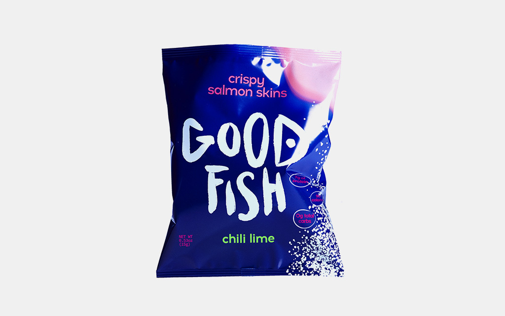 Goodfish is a new venture from the folks behind Harmless Harvest (sustainably sourced coconut water from Thailand). They upcycle Wild Alaskan Sockeye crispy salmon skins that would otherwise end up in a landfill, packaging a crunchy snack similar to chicharrones or pork clouds. Only they’re way healthier, at just 90 calories to a bag, with omega-3 fatty acids (which are good for the brain), tons of protein and marine collagen, which helps build lean muscle mass and fortify the skin, among other benefits.
