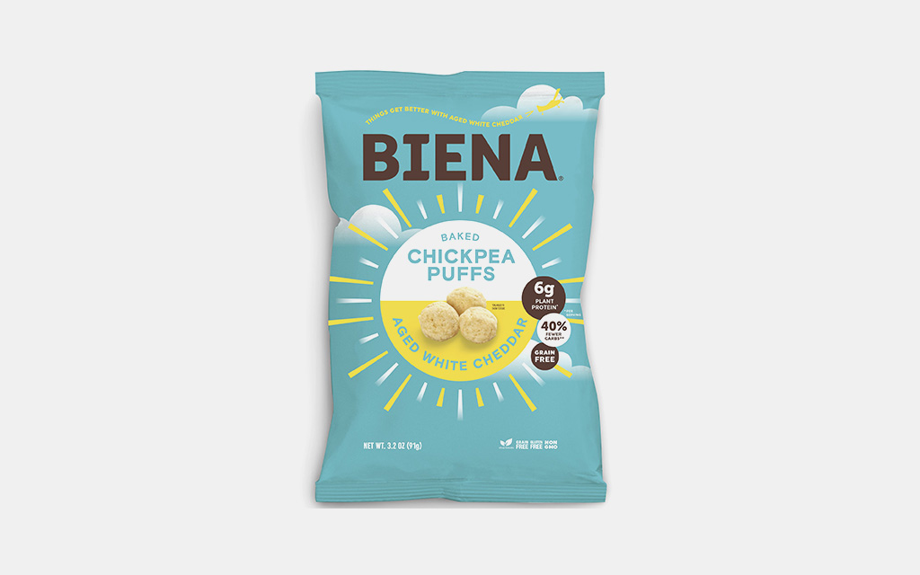 Another chickpea prophet, Biena started in a single store outside Boston eight years ago, and is now on shelves in 15,000 retail locations across America. Their snack collection includes both roasted chickpeas — which contain 70% less fat than peanuts, if you can believe it, without sacrificing any protein or fiber — and puffs, which come in let-your-hair-down flavors like White Cheddar, Ranch and Blazin’ Hot. Even the dark red color for that final flavor, it should be noted, is accounted for: Biena mixes beets, black currants and tomatoes to achieve it.